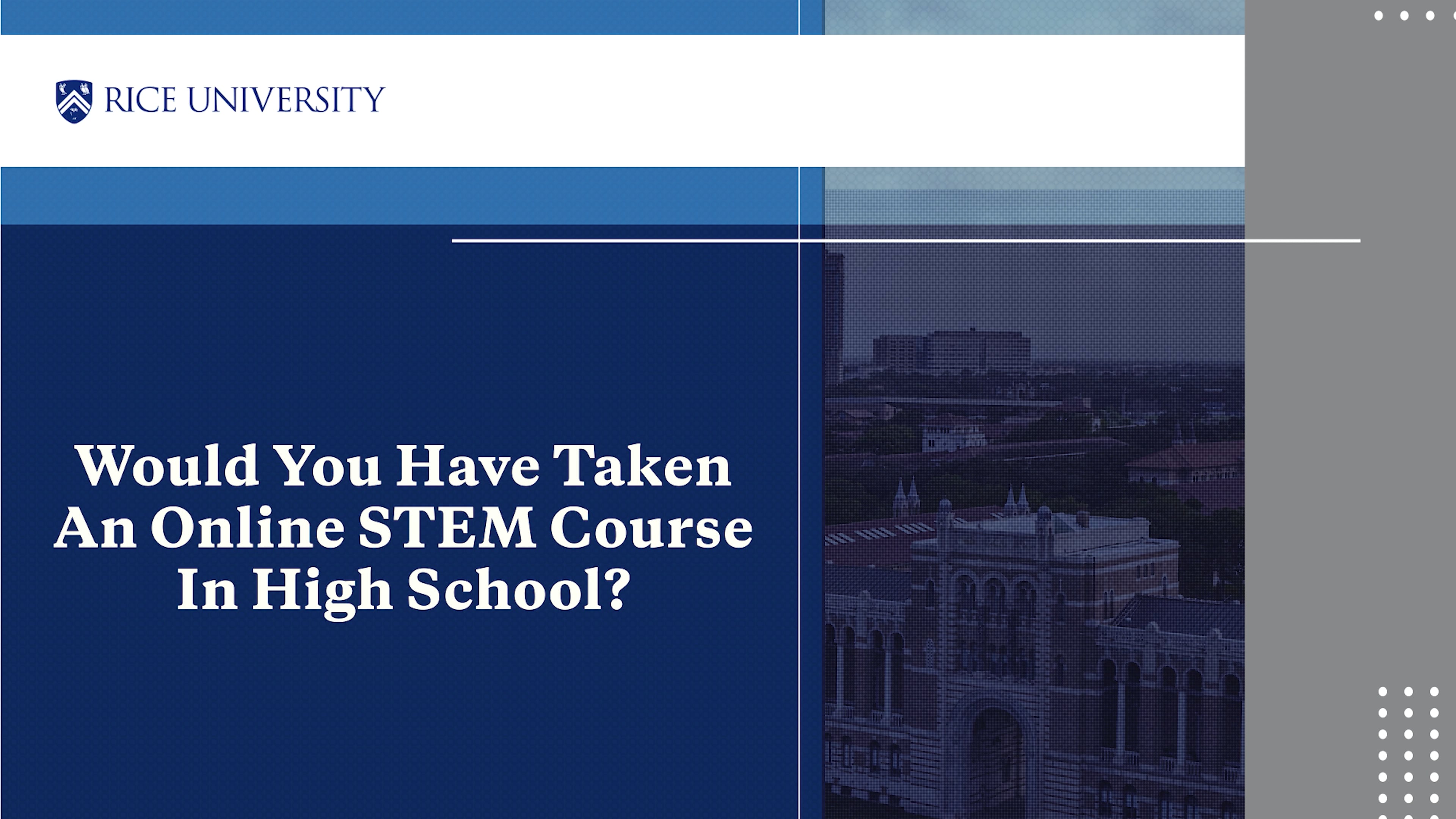 - Experience what it’s like to take a STEM course designed by Rice University faculty while you’re still in high school.